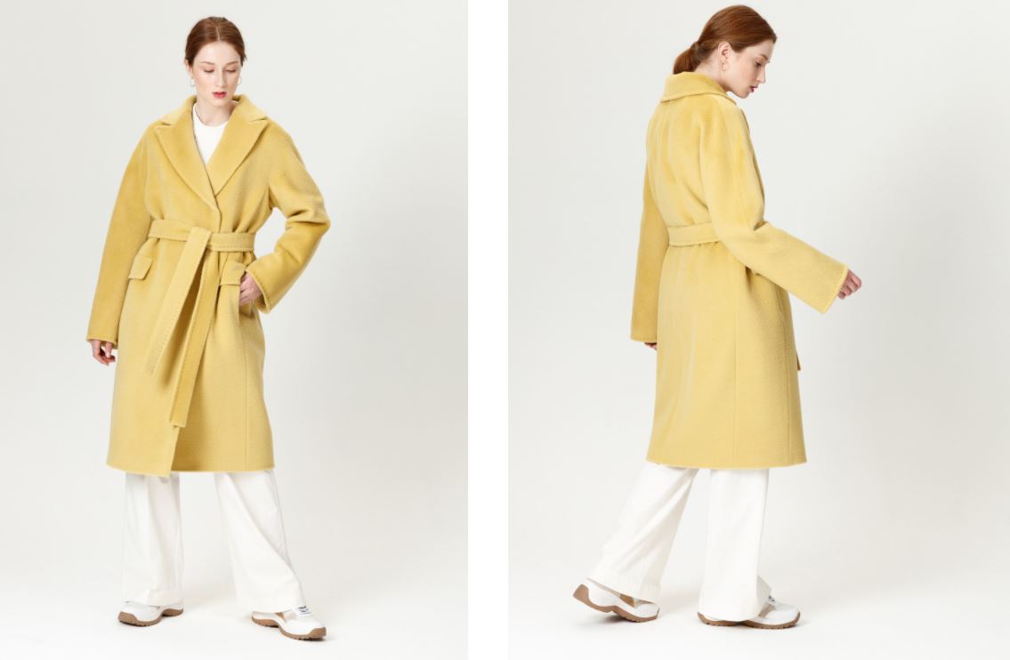 Пальто с английским воротником, застежкой на кнопки и внутреннюю пуговицу, дополнено поясом в тон. Два кармана в боковых швах имеют наружные клапаны, имитирующие горизонтальные карманы. Прямой силуэт, цельнокроеный рукав. С подкладкой.
